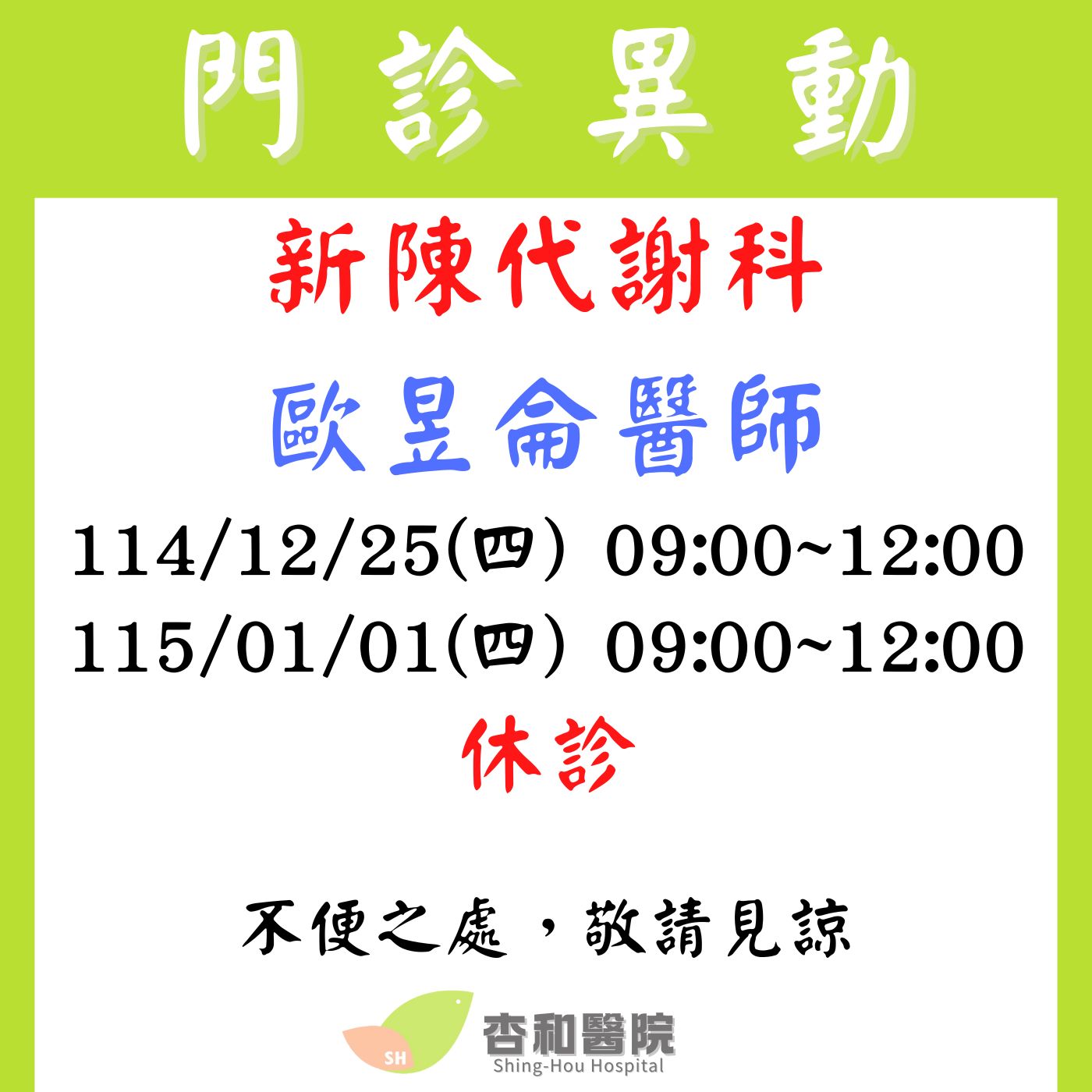 114/12/25 115/1/1 新陳代謝科 歐昱侖醫師 休診