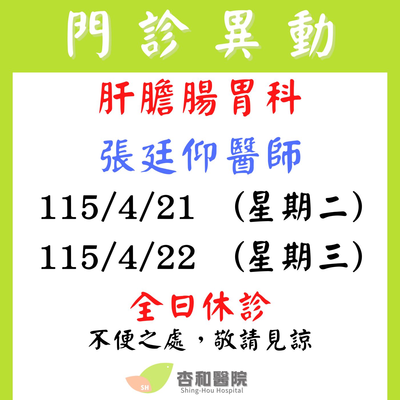 115/4/21~115/4/22 肝膽腸胃科 張廷仰醫師 休診