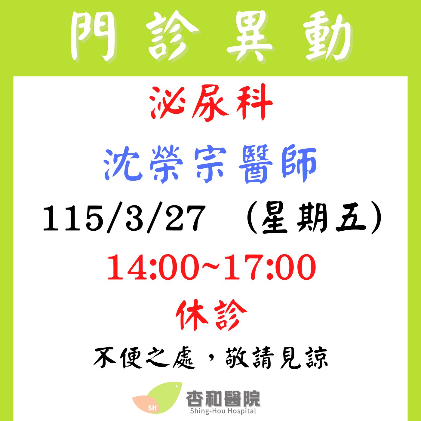 115/3/27 泌尿科 沈榮宗醫師 休診