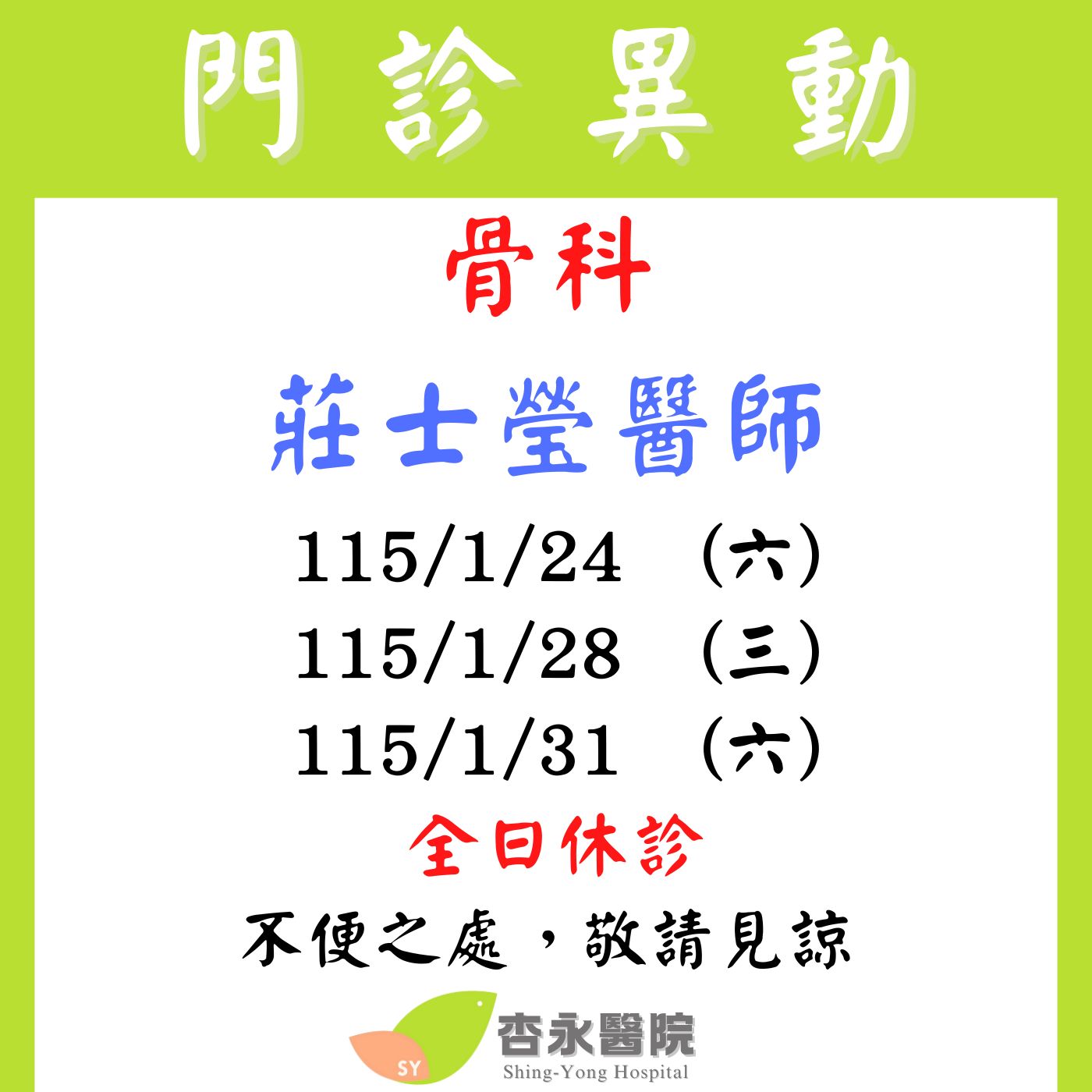 115/1/24 115/1/28 115/1/31 骨科 莊士瑩醫師 休診