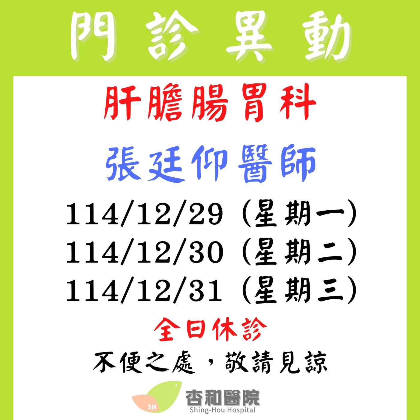 114/12/29~114/12/31 肝膽腸胃科 張廷仰醫師 休診