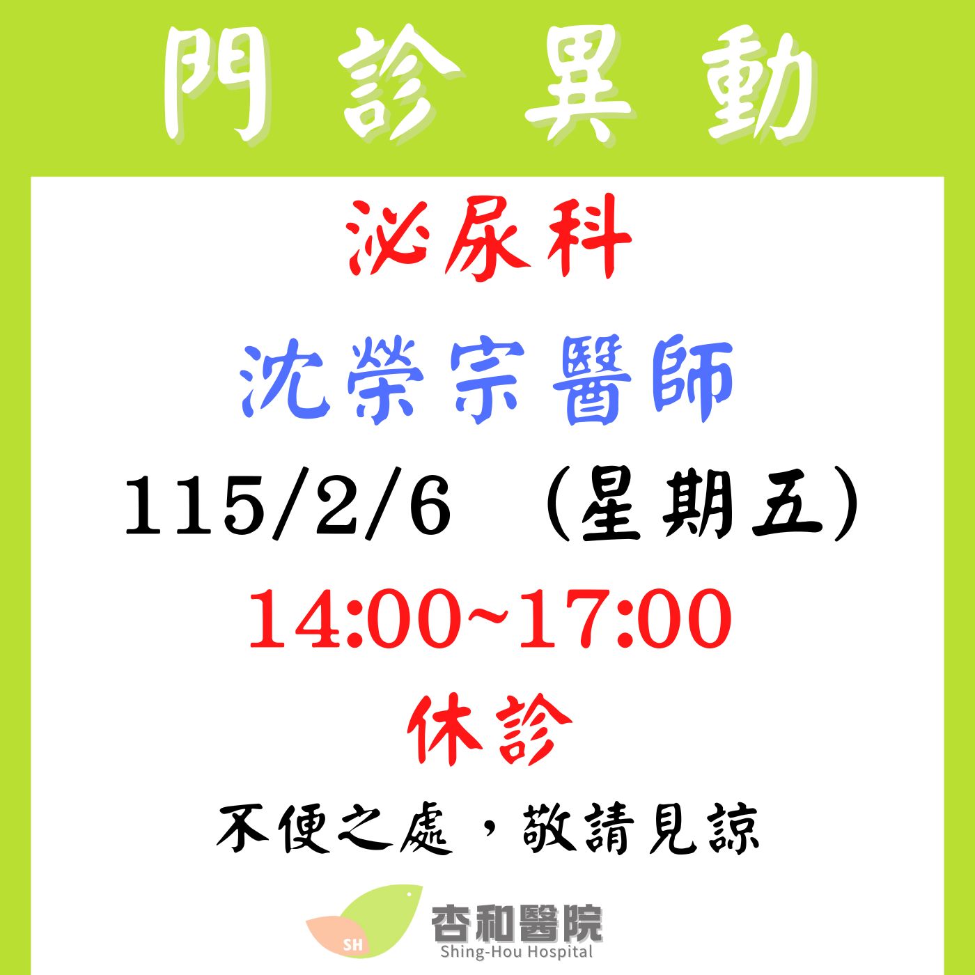 115/2/6 泌尿科 沈榮宗醫師 休診