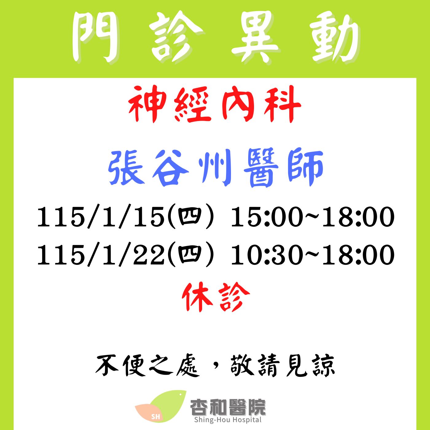115/1/14 115/1/22 神經內科 張谷州醫師 休診