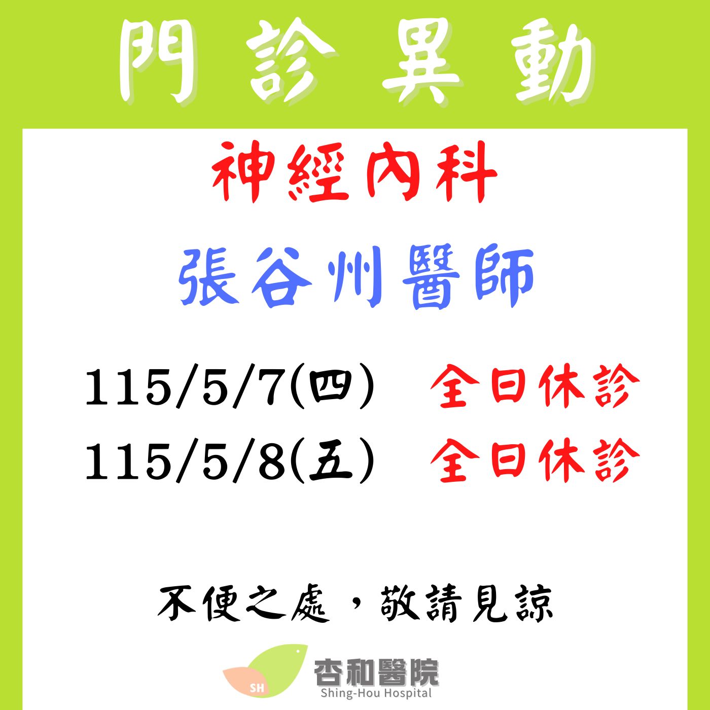 115/5/7~115/5/8 神經內科 張谷州醫師 休診